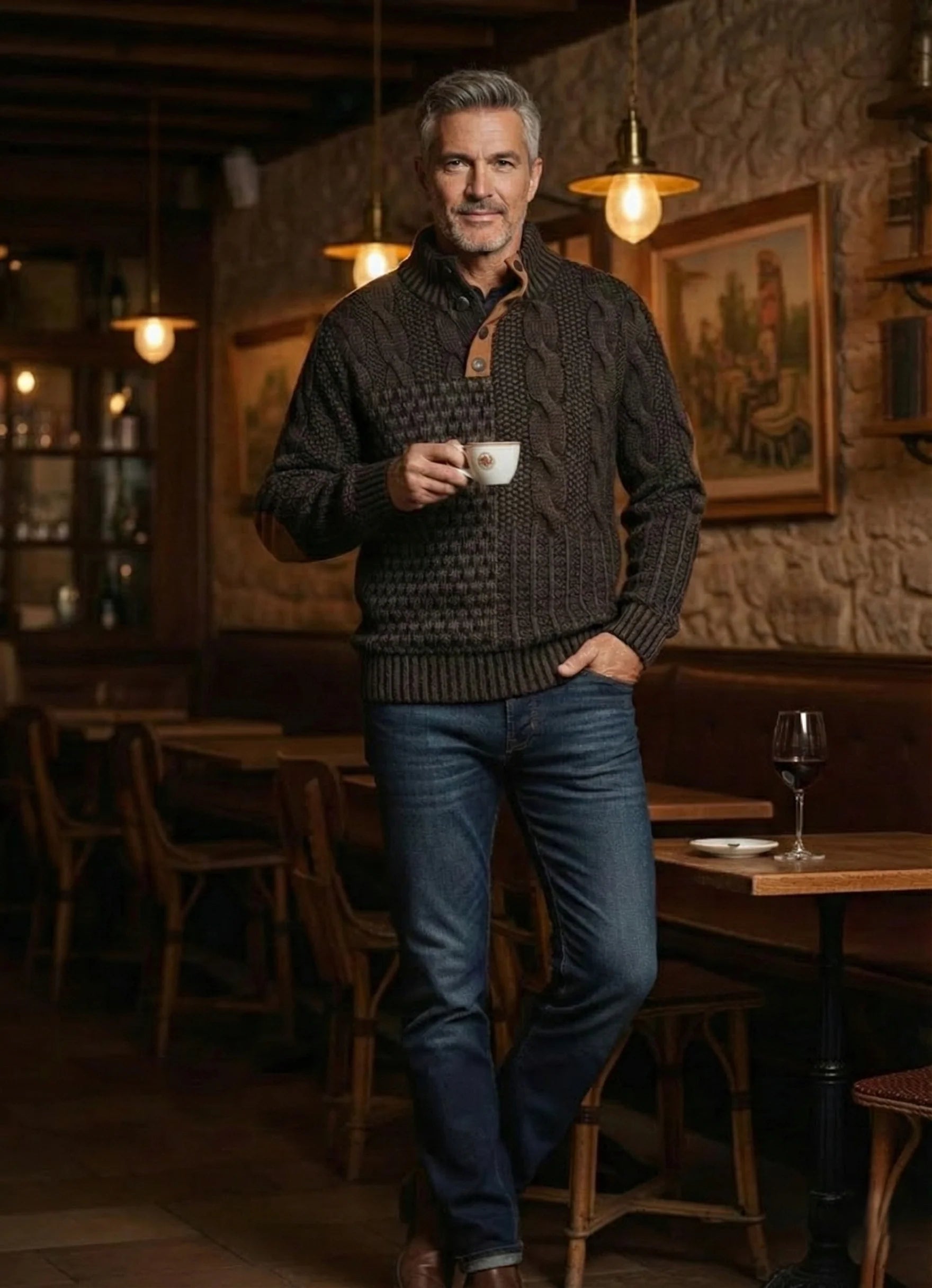 Combineer stijl en comfort moeiteloos met de André Vintage Trui. Het robuuste kabelbreiwerk, de stoere opstaande kraag en klassieke elleboogstukken geven je direct een tijdloze, mannelijke uitstraling. Een heerlijk warme must-have die elke winterse outfit direct naar een hoger niveau tilt.
